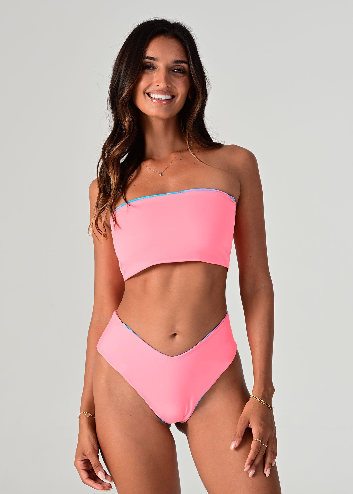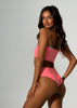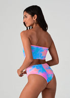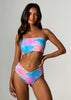 Barbados is back! Our eye-catching print combines a delightful palette of peachy, turquoise, pink and purple, creating a burst of colors that exude tropical charm. Embrace the spirit of the Caribbean as you soak up the sun in this captivating design. Our Lala bottoms are the bottoms you have always dreamed about. Mid-rise, cheeky coverage and v-shape. Reversible to a vibrant coral.