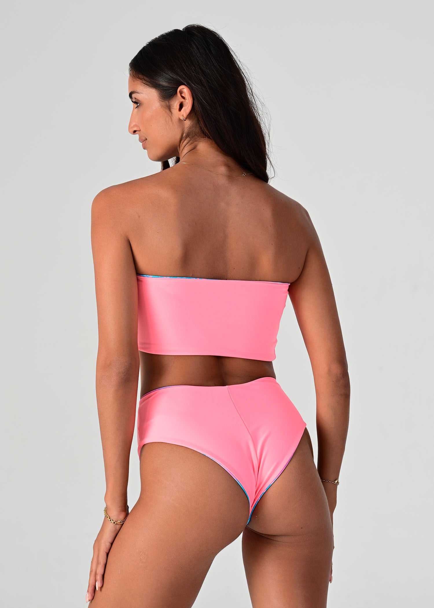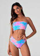 Barbados is back. Our eye-catching print combines a delightful palette of peachy, turquoise, pink and purple, creating a burst of colors that exude tropical charm. Embrace the spirit of the Caribbean as you soak up the sun in this captivating design. Our Laze top provides a seamless and flattering fit, hugging your curves in all the right places. The absence of straps allows for a sleek and minimalist look, perfect for showcasing your shoulders. Reversible to a vibrant coral.
