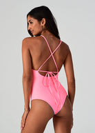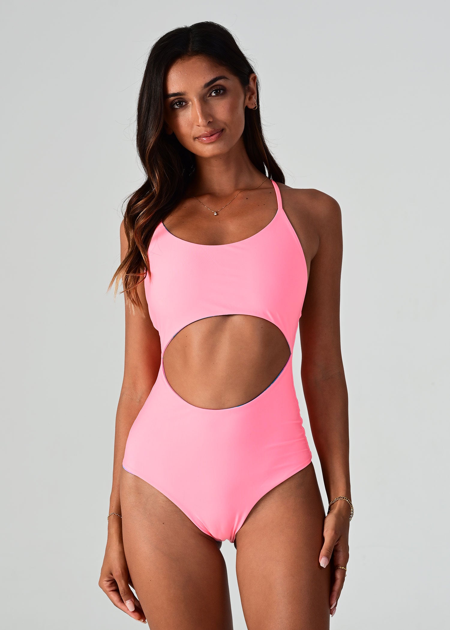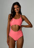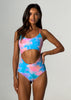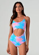 Barbados is back! Our eye-catching print combines a delightful palette of peachy, turquoise, pink and purple, creating a burst of colors that exude tropical charm. Embrace the spirit of the Caribbean as you soak up the sun in this captivating design. Thin straps and a cutout in the middle, this one piece is a true hybrid – you’ll get all the pros of a one piece and a bikini all in one. Reversible to a vibrant coral.