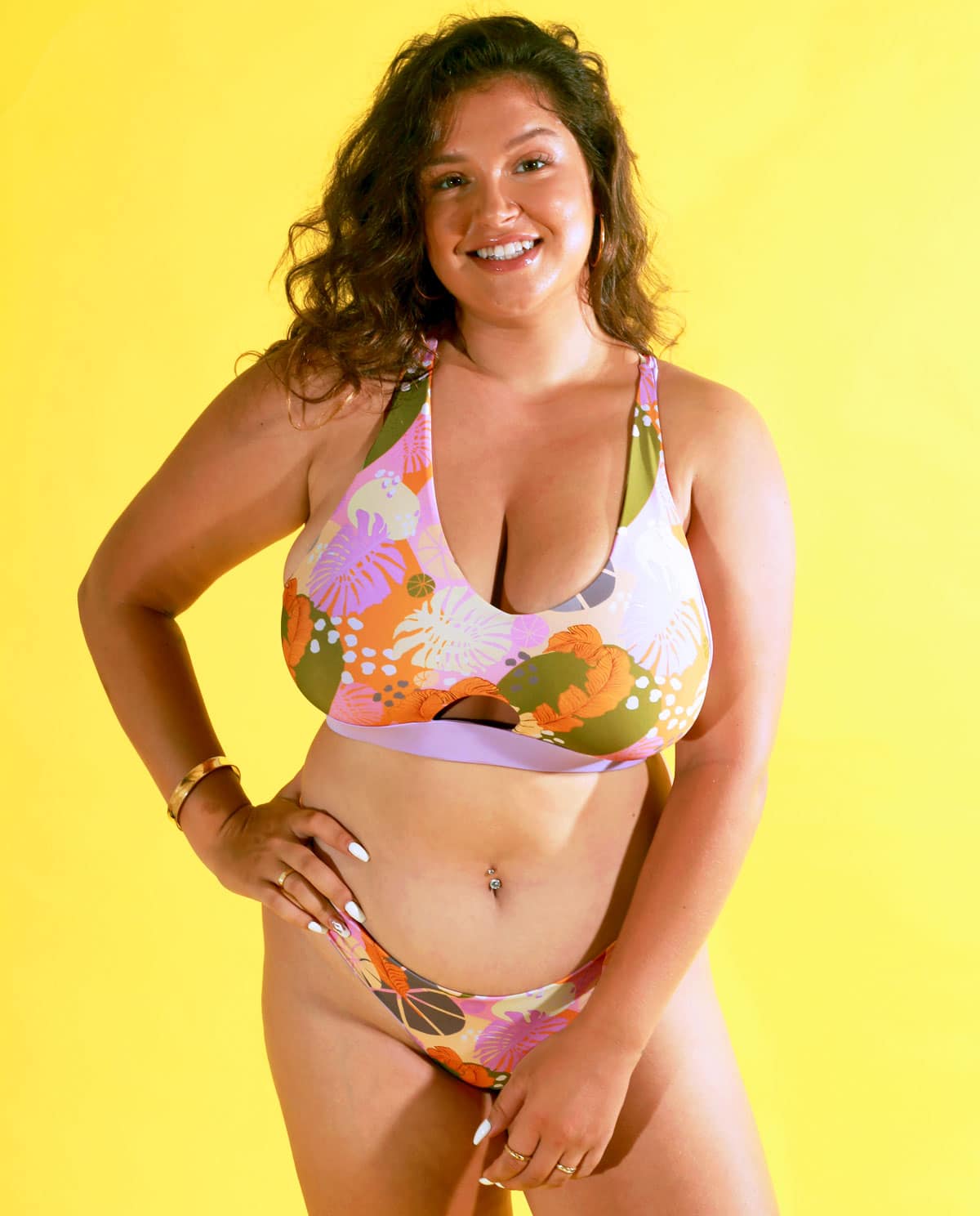 Our Jane print combines a trendy pastel lilac with a bright leafy print with a twist of cool retro vibes. This Jane is far from plain! This classic bestselling style is simple and versatile - you can wear it on your waist for that high cut look, or let it sit on your hips for a different feel. A must have for sunbathing!