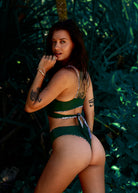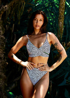 Unleash your wild side with our Foxy bottom in Liana. The untamed zebra print with black and white stripes meet our most-loved minimal cut. Designed to flatter your curves and show off those legs like never before. This style gives you that extra coverage in the front, while the cheeky back is made to stun. And for when you're feeling more low-key jungle vibes? Just flip to the deep dark green reverse side. Ahhh add-to-cart!
