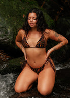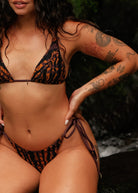 Our Zora bottom is all about the perfect cut designed to hug your curves just right. With adjustable string ties, you control the fit. The Cocoa print brings a raw, earthy edge with its bold black and brown tie-dye stripes. This bottom pairs effortlessly with any top. We’ve added edgy golden charms at the ends of the strings, giving it that extra jungle-chic vibe. Cocoa is ready to roam.