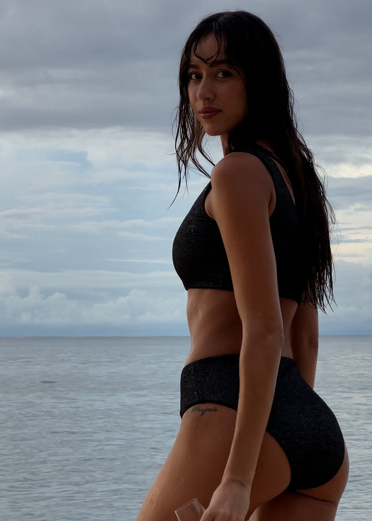 Our shimmer fabric is back but this time in Noir. Shimmer Noir literally makes you sparkle from day till night. Our Lou Lou top features a modern one-shoulder silhouette that flatters beautifully and stays secure. Reversible from black subtle shimmer to classy solid black, giving you two looks in one. Bold, timeless, and effortlessly glamorous.
