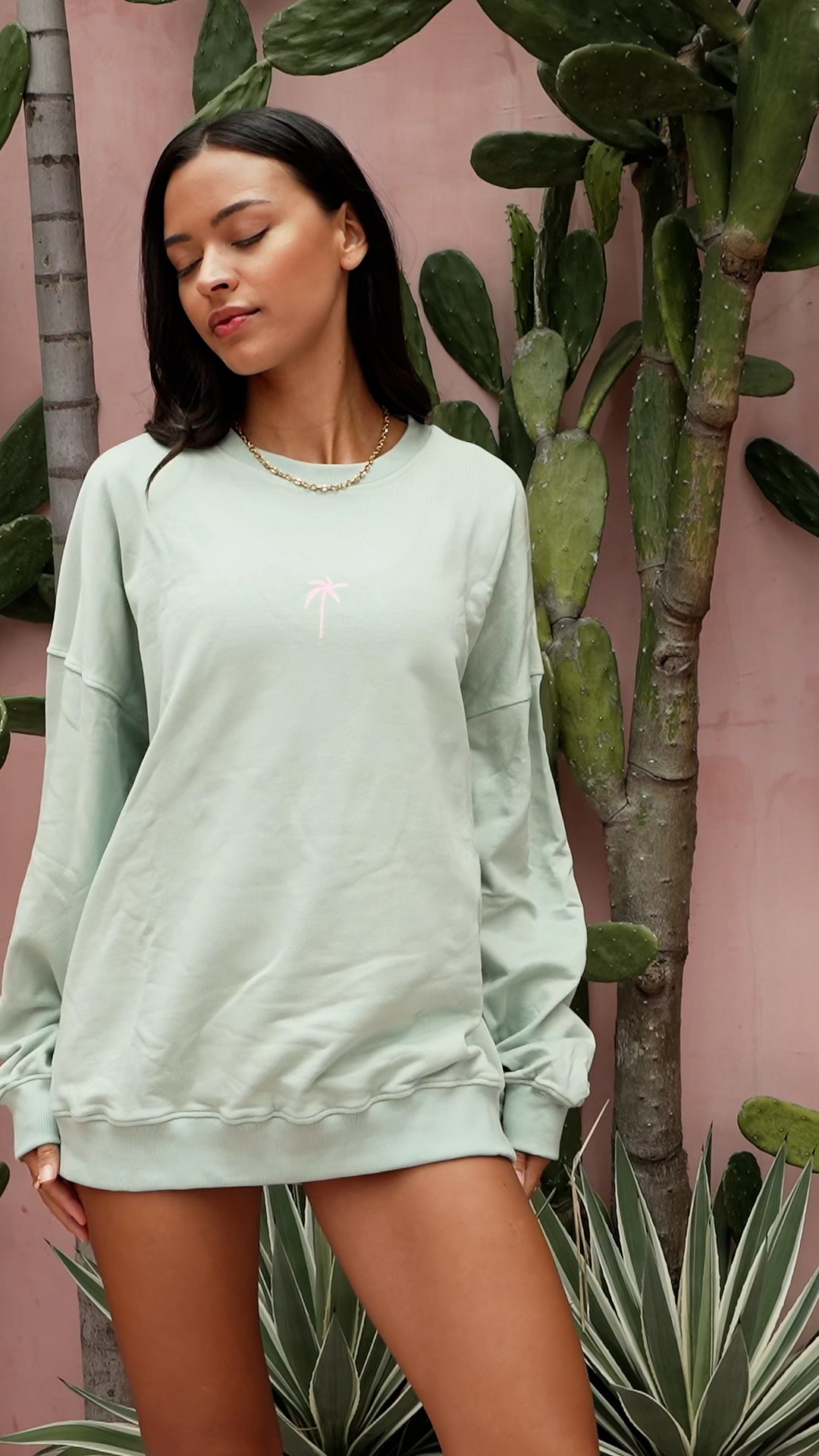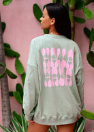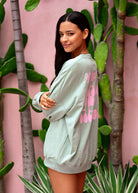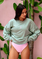 Relax and unwind in the cozy Palmy crewneck! This sage green, relaxed-fit crew offers an instant tropical vacay vibe with its cute pink palm tree print on the chest and the cool logo detail on the back. Our signature crewneck fit is designed with one-size fit for ultimate comfort.